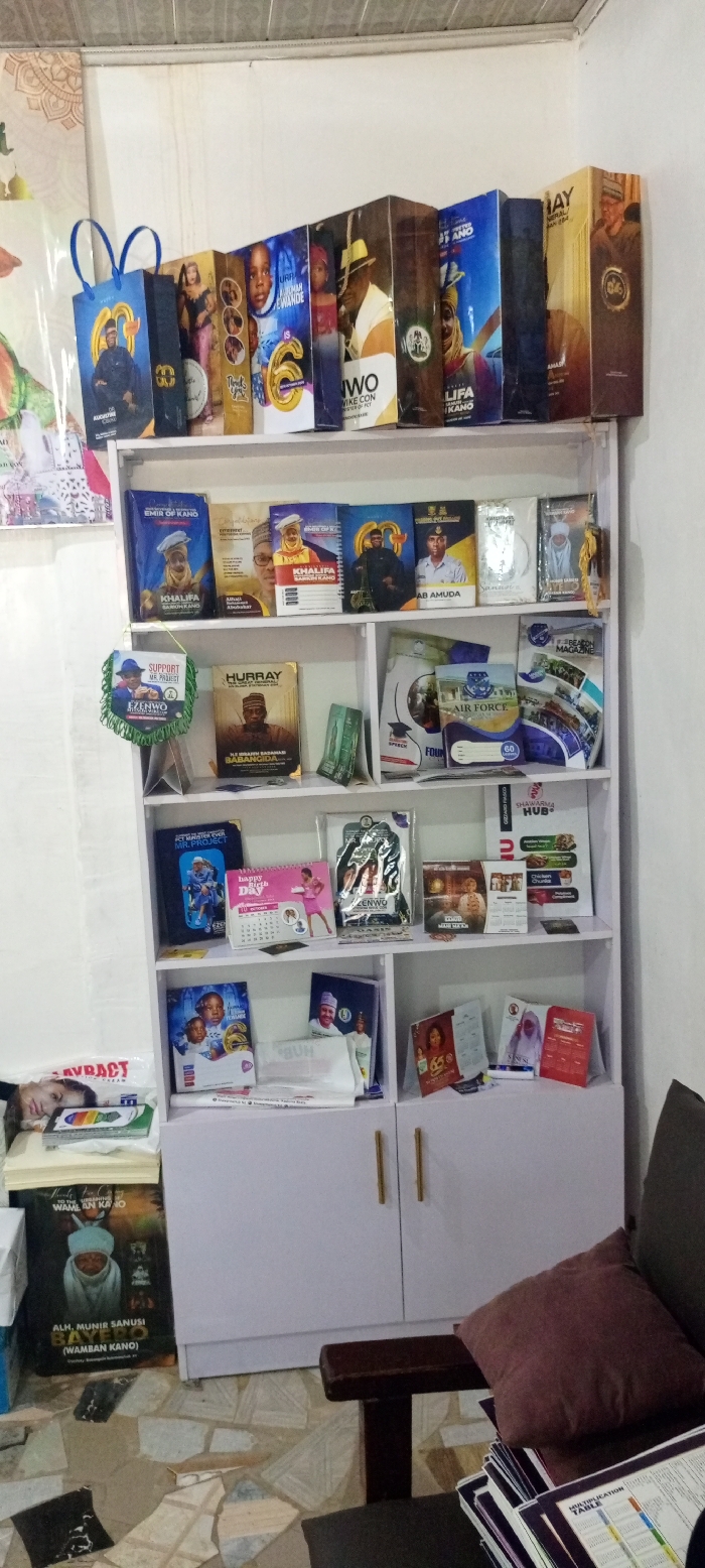 The image depicts an interior scene in Dadi Riba, Nigeria, featuring a white, five-shelf wooden display unit laden with diverse printed materials