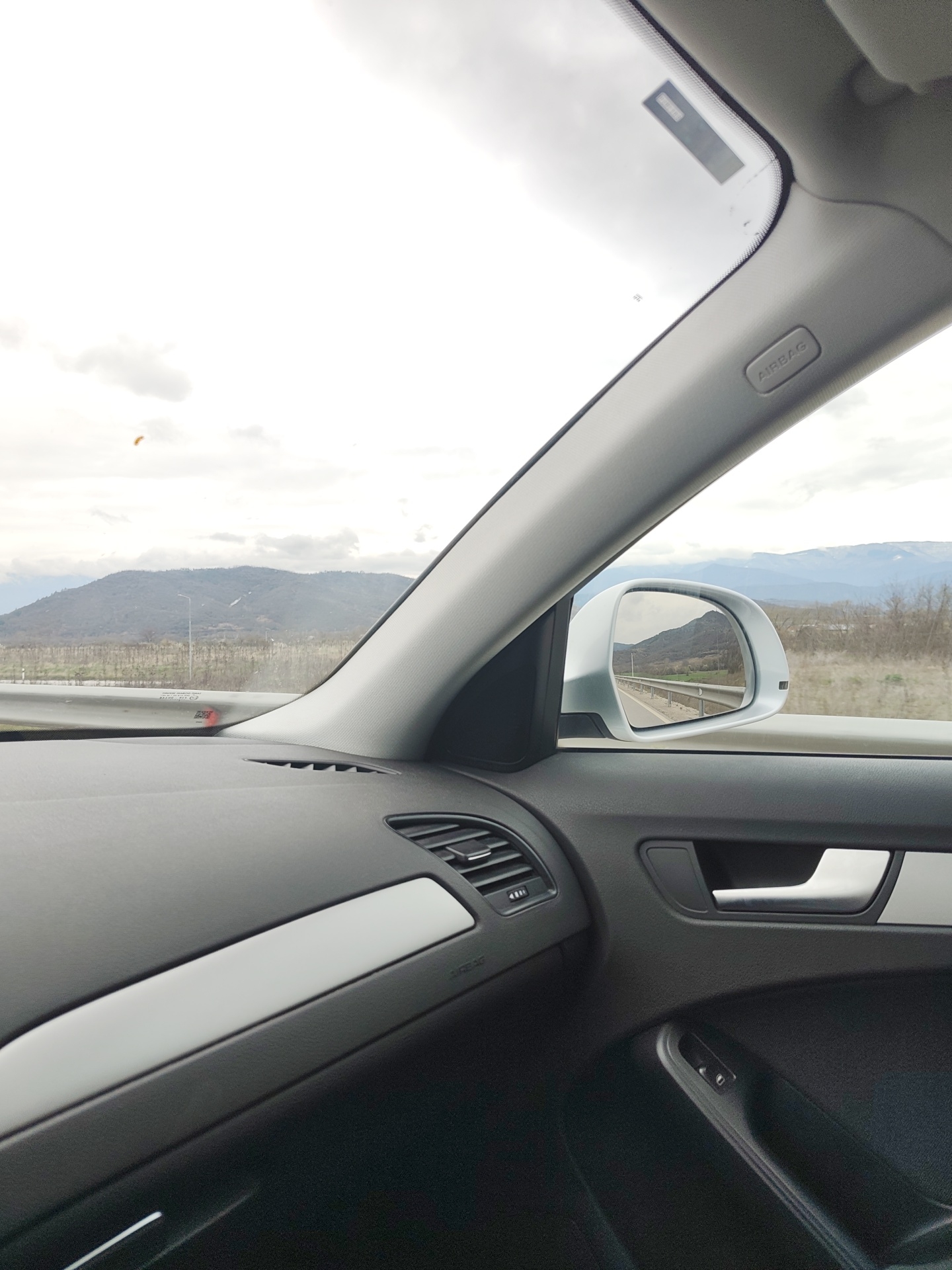 n interior view from inside a car, likely on a highway. The dashboard is visible, along with the passenger-side window and side mirror. The side mirror reflects the road and landscape that is visible out of the windshield. The landscape includes mountains and roadside vegetation. The sky is overcast. The location is Novachene, Bulgaria.