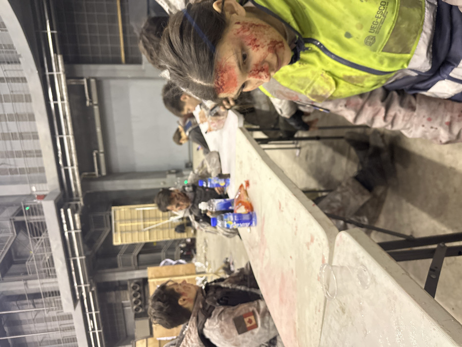 The image depicts an indoor scene within a large, industrial-style facility or studio located in Huangdao District, China. In the immediate foreground, a female individual, partially obscured, is visible with significant simulated blood spatter across her face, particularly on the forehead, nose, and cheeks. She wears a yellow-green high-visibility vest with a "UEG-ESCO" logo and a light-colored long-sleeved garment underneath, also stained with simulated blood. In the midground, several individuals are seated at two conjoined white folding tables. At least two males are clearly visible. The male on the far left wears a camouflage-patterned uniform with a visible Canadian flag patch on his upper right arm. He has simulated blood on his face and clothing. To his right, another male in a similar uniform also exhibits simulated facial bloodstains. Both appear to be resting. The tables are cluttered with objects including multiple clear plastic water bottles with blue caps, a red plastic bag, and a clear plastic cup. The table surfaces themselves show simulated bloodstains. Additional figures are dimly visible further down the table. The background reveals the expansive nature of the facility, characterized by high ceilings, grey concrete walls, exposed metal structural elements, ventilation ducts, and a multi-level mezzanine or catwalk system. Scattered production-related materials, such as wooden flats or crates, are visible on the concrete floor. The overall lighting is artificial and somewhat subdued.