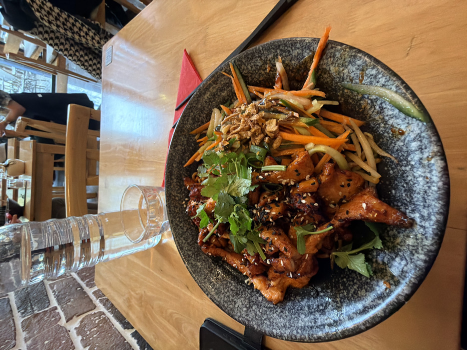 The image presents a close-up view within a casual restaurant located in Strasbourg, France. In the immediate foreground, a dark, speckled ceramic bowl holds a prepared meal. The dish consists of glazed, reddish-brown meat or protein pieces liberally sprinkled with black and white sesame seeds and fresh cilantro sprigs. Adjacent to this, a vibrant salad composed of julienned carrots, cucumbers, and bean sprouts is visible, topped with crispy fried shallots or onions and chopped peanuts, all resting in a dark, glossy sauce. To the left of the bowl, a black smartphone with a dark case rests on a light-colored wooden table. A clear plastic water bottle, partially filled, stands next to a clear glass containing water. To the right of the meal, a red paper napkin is visible beneath a pair of black chopsticks resting against the bowl. The background, largely out of focus, reveals the restaurant's interior. A textured brick wall in various shades of brown and red lines the left side of the scene. Further back, several light-colored wooden tables and chairs are arranged. Blurred figures of other patrons are discernible, including one person seated at a distant table and another partially obscured behind the water bottle. A window or glass partition is visible on the far right, admitting natural light, and a black and white patterned coat hangs on the back of a chair.