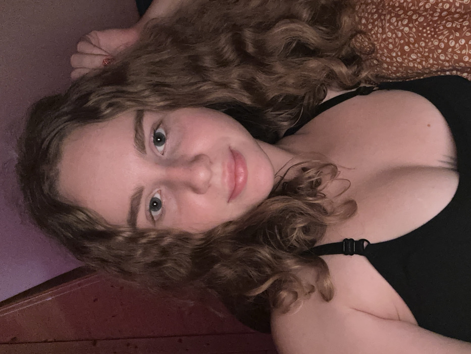 A young woman with curly, light brown hair and fair skin looks directly at the camera with a slight smile