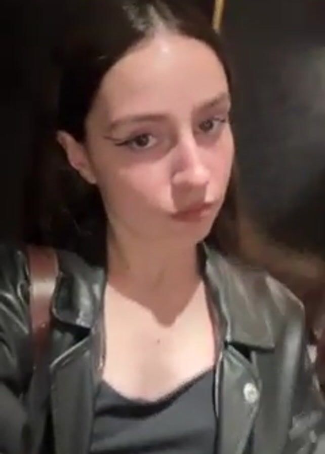A young woman with long brown hair and fair skin stands in what appears to be an elevator or small enclosed space
