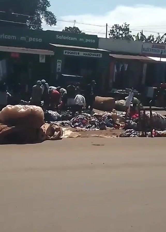 street market in a Kenyan town. There are several vendors displaying their goods on the ground and on tables. These goods appear to be mostly clothing. People are milling about, presumably shopping. Some of the businesses in the background have signs for "Safaricom m-pesa," "Promise Hardware," and "Electronics & Household." A person walks by. A motorcycle is parked nearby. There is a cell tower in the distance. The sky is blue.