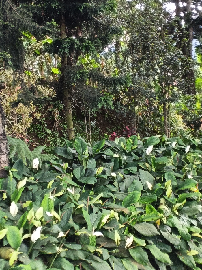 Lush greenery dominates the view. A dense layer of broad, green leaves fills the foreground, interspersed with delicate white flowers. Behind this, trees rise, their foliage creating a layered effect of deep greens and shadowy depths. Hints of other plants and colors peek through the trees, suggesting a vibrant, diverse undergrowth. The overall impression is one of a thriving, verdant environment, possibly a tropical forest or garden.
