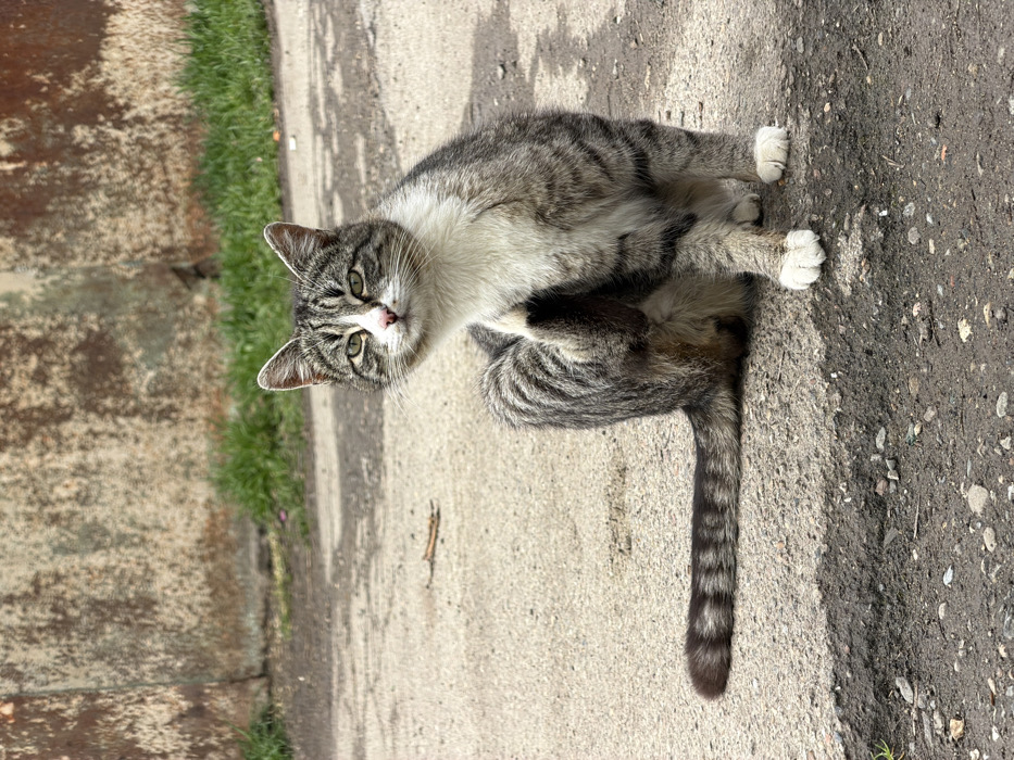 - "A domestic cat, displaying a grey and black tabby pattern with a prominent white chest, chin, and paws, is observed seated on a concrete and dirt surface in the city of Beryozovy, Russia" by FM-t12ef2, licensed under CC BY 4.0