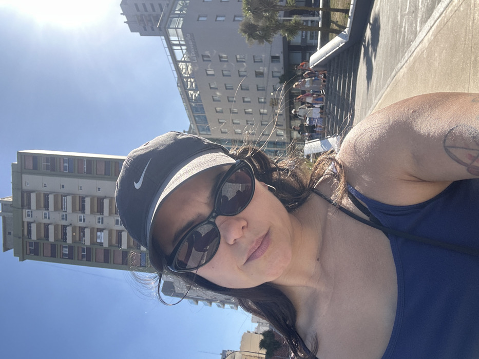 A woman in sunglasses and a Nike cap poses for a selfie. She is wearing a blue top. Tall buildings stand in the background under a bright sky. A group of people are also visible behind a railing. The image is slightly angled, giving a dynamic perspective.