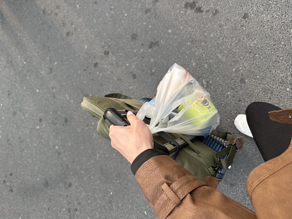 The scene depicts a first-person perspective looking downward in Huangdao District, China, on a grey asphalt surface. A person's right arm, clad in a brown, textured, long-sleeved outer garment with a buckle detail on the cuff, extends forward. A black inner sleeve or wristband is visible beneath the brown garment. The hand firmly grips the black, textured, telescoping handle of a piece of luggage. An olive-green fabric bag or backpack with visible straps and metallic buckles is situated on top of or attached to the luggage. A translucent white plastic shopping bag, containing various items including a package with green labeling and additional indistinct contents, hangs from the same hand or luggage handle. Beneath the olive-green bag, a portion of a dark blue, ridged hard-shell suitcase is discernible. The person's lower right leg is visible, dressed in black pants or leggings, with a white sneaker on the right foot. A segment of a brown shoe or boot is partially visible on the left side of the frame.