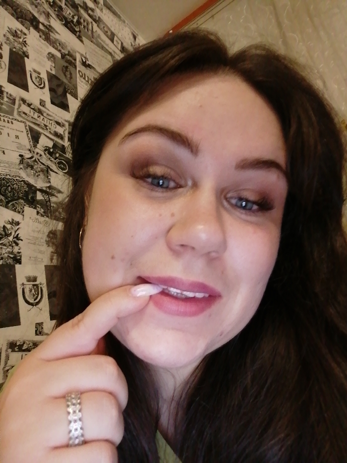 An indoor, close-up photograph depicts a female individual in Chaikovsky, Russia. The subject has dark brown hair, blue eyes with visible eye makeup, and a faint smile. Her right index finger, adorned with a silver-toned ring featuring a geometric pattern and a long, light-colored artificial nail, is positioned against her lower lip and visible upper teeth. The background is a wall covered in black-and-white wallpaper, which features a collage of vintage newspaper clippings, illustrations (including a vintage car), and text. The scene is illuminated by artificial light.