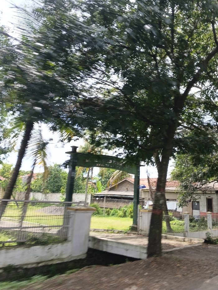A green archway stands over a small bridge in a rural scene. Buildings with red tile roofs are visible beyond the arch. A single tree stands beside one of the bridge's supports, partially obscuring the view. The foreground is blurred, indicating motion. Palm trees can be seen in the background, adding a tropical element to the setting. A green lawn fills the space beyond the bridge, and a fence runs along the edge of the property.