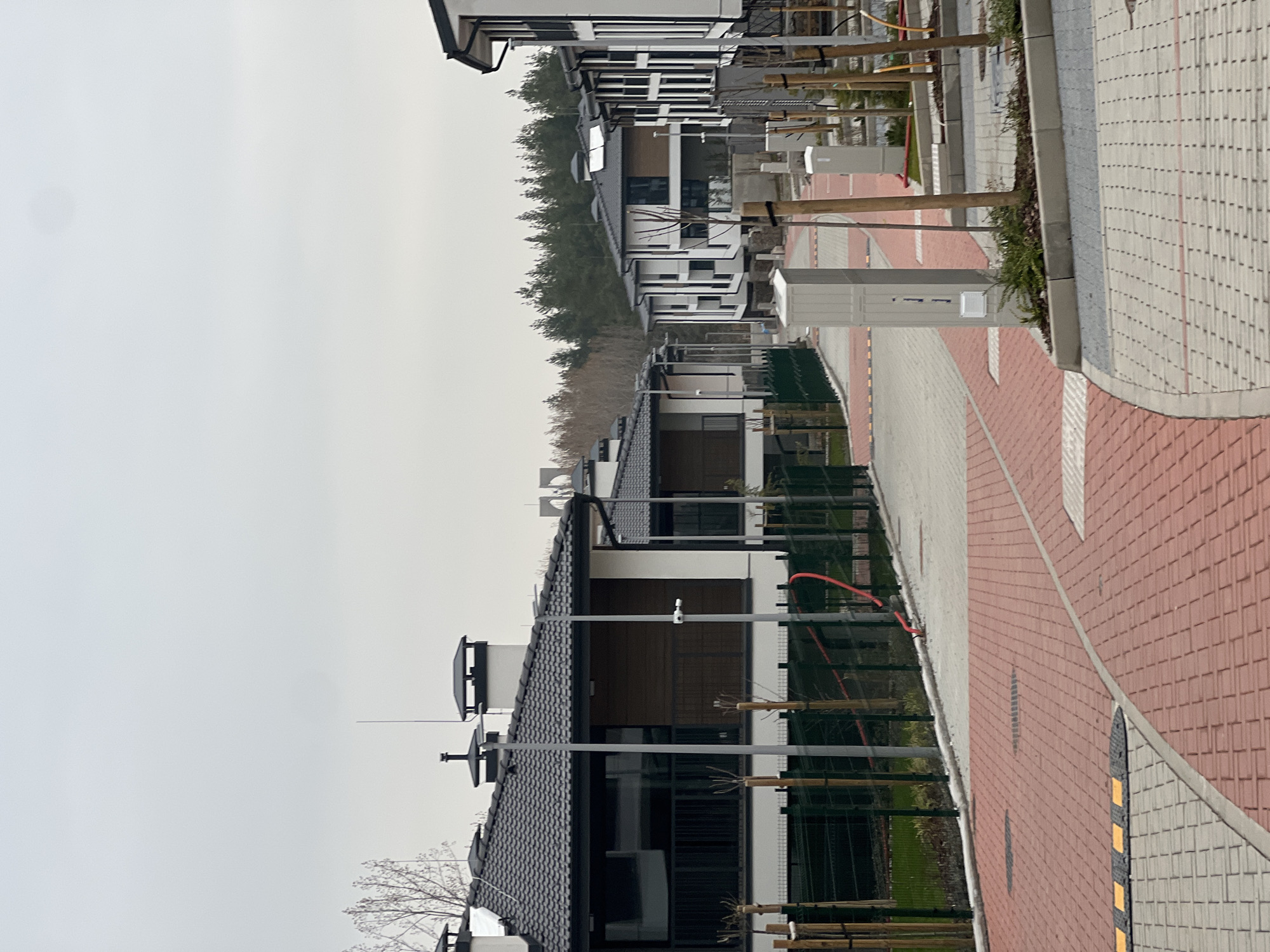 The image depicts a street in Bistritsa, Bulgaria, lined with modern townhouses. The structures have black tiled roofs and white facades with dark-framed windows. A pedestrian walkway, paved with red and gray rectangular pavers, runs along the side of the buildings, separated by a narrow strip of green space enclosed by a low fence. Street lighting fixtures are placed at intervals along the walkway. Trees with thin trunks, supported by stakes, are also planted along the street. In the background, a line of evergreen trees can be seen. The sky is overcast, creating a diffused, gray light.