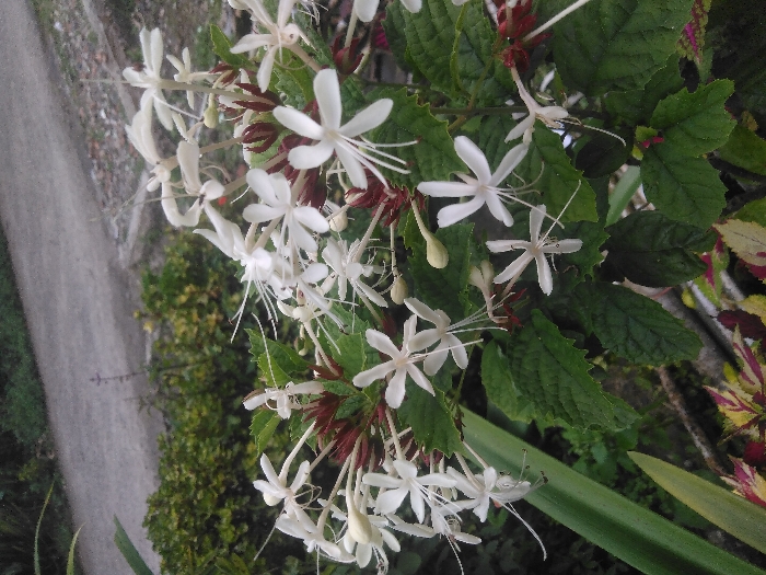 The image presents a close-up, slightly elevated perspective of a flowering plant situated outdoors in Otta, Norway. The primary subject is a cluster of numerous white flowers, each characterized by five elongated, slender white petals radiating from a central point. Prominent white stamens, tipped with dark anthers, extend significantly beyond the petals. Interspersed among the open flowers are dark reddish-brown, elongated structures consistent with unopened buds or calyxes. The flowers are supported by dark green, ovate leaves exhibiting visible venation. In the lower-left foreground, a broad, plain green leaf blade is partially visible, adjacent to variegated foliage displaying irregular patterns of yellow, light green, and reddish-purple. The midground consists of out-of-focus green shrubbery or dense foliage. The background, also blurred, reveals a textured gray surface consistent with an unpaved road or pathway. No human figures, animals, or direct actions or interactions are depicted within the frame. The lighting is natural and appears diffused.