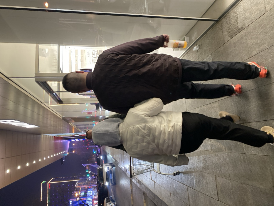 An urban nighttime scene on a sidewalk in the city of Linghe, China, adjacent to a street with traffic. **People:** Two individuals are walking from the viewer's perspective, away from the camera, on a paved sidewalk. 1. **Individual 1 (Right):** An adult male with a short, faded haircut. He is wearing a dark brown quilted jacket or vest over a dark long-sleeved shirt, dark pants, and athletic shoes with prominent orange/red soles. His right arm is extended, holding a transparent plastic bottle containing an orange liquid. 2. **Individual 2 (Left):** An adult individual, likely female, wearing a white puffer jacket with a light grey hood pulled up. She is wearing dark pants and light-colored flat shoes. Her right arm appears to be linked with the left arm of Individual 1, suggesting they are walking arm-in-arm. A third individual, partially obscured, is visible between and behind the two primary figures, wearing a dark jacket. **Objects:** A silver-colored metal shopping cart is positioned on the sidewalk behind Individual 2, slightly to the left. A small piece of white debris is present on the sidewalk near the building wall, below Individual 1's right hand. **Environment:** The sidewalk is paved with light grey tiles and appears damp, reflecting artificial light. To the immediate right, a modern building with large, continuous glass windows features the white text "HUAWEI" on its upper fascia. The interior of this building is brightly lit, revealing some merchandise displays. To the left of the sidewalk is a multi-lane street with vehicular traffic. Several cars, including a white SUV with headlights on, are visible on the wet road, reflecting light. In the background, multiple high-rise buildings are visible, illuminated with various colored architectural lights, predominantly blue and red, indicating an active urban area at night. The scene is extensively lit by artificial sources including streetlights, vehicle headlights, and building lights.