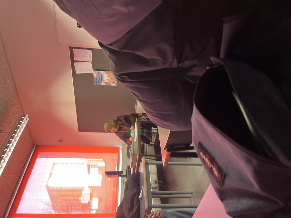 The image depicts an indoor classroom in Porto, Portugal, from a low, seated perspective. In the immediate foreground, a dark purple Eastpak pencil case rests on a light pink desk surface, partially obscuring the lower-right corner. The back of a person wearing a dark purple hooded jacket occupies the upper-right foreground. In the mid-ground, a woman with shoulder-length blonde hair and glasses is seated at a wooden desk, wearing a dark jacket and a plaid scarf. She is focused, looking intently towards the left. A book or binder and a pen are positioned on the desk in front of her. To her left, a computer monitor is situated on an adjacent desk. The left side of the frame features a large window covered by bright red roller blinds, through which a sunlit multi-story building exterior is partially visible. This strong external light casts a significant red hue across the ceiling and upper walls of the classroom. Fluorescent light fixtures are visible on the ceiling. The back wall features a dark gray chalkboard or whiteboard with several papers and a colorful poster with orange graphical elements attached. A person's arm, wearing a light blue sleeve, is visible at a desk in the mid-left.