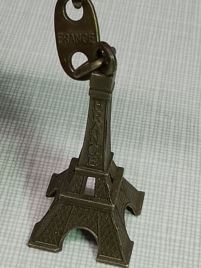 The scene, located in Gorna Oryahovitsa, Bulgaria, presents a close-up, high-angle view of a metallic keychain. The keychain features a miniature replica of the Eiffel Tower, rendered in an antique bronze or darkened brass finish, resting on a light-colored surface with a subtle grid-like texture. The Eiffel Tower model exhibits intricate structural details, including visible cross-bracing and arched openings at its base. The word "FRANCE" is engraved vertically along one of the tower's upper sections. A small split ring connects the apex of the tower to a flat, key-shaped charm, also in a matching metallic finish. The word "FRANCE" is horizontally engraved on the head of this key-shaped charm, which also features two circular cut-outs. The object is illuminated from above, casting soft shadows to its right. No people, actions, or interactions are visible.