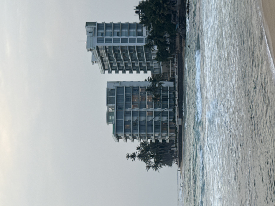 This image displays a coastal scene in Talpe, Sri Lanka, under an overcast sky. In the foreground, a light-colored sandy beach transitions into an ocean with moderate waves breaking, characterized by white foam. The background is dominated by two modern, multi-story white buildings erected directly on the shoreline. The building on the left is shorter, featuring a rounded architectural element on its roof and several illuminated interior windows. To its right, a taller, more rectangular building stands with numerous balconies. Clusters of palm trees are situated around and between these structures, particularly dense to the left of the first building. Along the immediate shoreline near the buildings, dark rock formations are visible. Small, indistinct human figures are present on the beach to the far left, near the waterline, with at least one appearing to be in the shallow ocean. No specific actions or interactions are clearly discernible due to the distance.