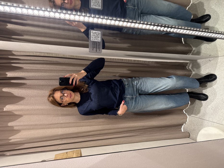 A female individual is depicted standing in a retail fitting room in Odivelas, Portugal, taking a mirror selfie. She wears a long-sleeved navy blue top, light blue wide-leg jeans, black pointed-toe boots, and dark-rimmed eyeglasses. Her medium-length reddish-brown hair is down, and her fingernails are painted red. A silver-toned watch is visible on her left wrist, and her left hand is casually placed in her left jeans pocket, while her right hand holds a black smartphone directed towards the mirror. The fitting room features beige fabric curtains as the primary background and a light grey tiled floor. A full-length mirror with an integrated vertical strip of lights on its right edge reflects her image. Affixed to the mirror is a white rectangular sticker containing a black QR code for customer feedback, labeled with "O que achou do nosso atendimento?" (Portuguese) and "HOW WAS THE SERVICE TODAY?" (English). In the lower-left corner, a small, white, cylindrical stool is partially visible. A light brown paper bag, possibly from a retail store, hangs on a fixture or hook on the left side, behind the curtain line.