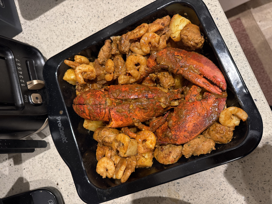 A black ProCook roasting pan, approximately rectangular with flared handles, is filled with a cooked meal. The central feature is a whole, cooked lobster, split longitudinally, coated in a thick, reddish-brown sauce. Surrounding the lobster are numerous peeled, cooked shrimp, cubed potatoes, and several pieces of cooked sausage or meatballs, all similarly coated in the reddish-brown sauce. The pan rests on a light-colored, speckled countertop. In the upper background, a black toaster with a metallic browning control dial set between "1" and "2," and a "Stop" button, is visible. A portion of another black kitchen appliance is present on the countertop to the left. The scene is illuminated by overhead light. This setup is located within a kitchen in Wychavon, United Kingdom.