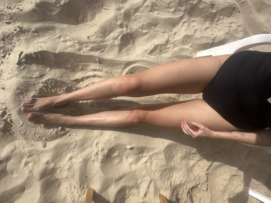 An overhead, high-angle image captures the lower torso and legs of an individual reclining on a sandy beach in Tel Aviv, Israel. The subject's legs are extended and parallel, with their bare feet positioned towards the top of the frame. The individual wears black swimwear covering the lower abdomen and upper thighs. The left hand, exhibiting small tattoos on the forearm, rests on the upper left thigh. The scene is illuminated by direct sunlight, casting distinct shadows on the undulating sand. A partial view of a white beach chair is visible beneath the subject, and a wooden element is present on the far left. A single discarded cigarette butt is observed embedded in the sand towards the upper right of the frame.