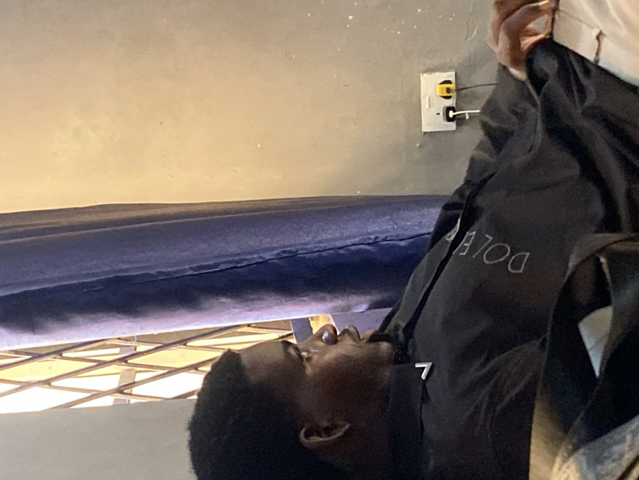 An indoor scene in the city of Unknown, Nigeria, shows a young adult male of dark complexion seated in profile, looking towards the right side of the frame