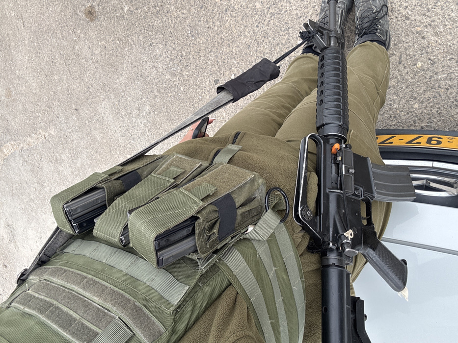 The image provides a high-angle, close-up view of an individual in Efrat, Palestinian Territory, equipped with tactical gear