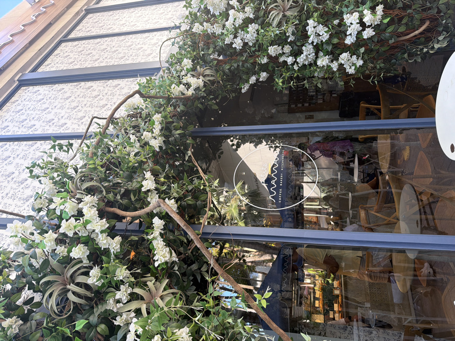 The image displays the entrance of "petite mamana," a coffee, bakery, and kitchenette located in the Miami Design District, Miami, United States of America. The glass storefront is heavily decorated with artificial green foliage, intertwined natural branches, abundant white flowers resembling bougainvillea, and integrated light-colored tillandsia air plants, creating a dense, verdant archway. Above the entrance, the building's facade is a light-colored, textured material, topped by a brown scalloped awning. Reflected in the left portion of the glass, an individual in a light-colored shirt and pants stands next to an outdoor market stall displaying baked goods under a dark blue scalloped umbrella. Another person, dressed in a darker, possibly purple garment, is partially reflected near the center of the entrance. Visible through the glass are multiple small, round white tables and wooden chairs, indicating an indoor seating area. The "petite mamana" logo, a white circular decal with "petite mamana" in wavy script and "COFFEE BAKERY KITCHENETTE" below, is affixed to the glass. Reflections of blue sky and palm trees confirm a bright, outdoor, tropical setting. The scene is static.