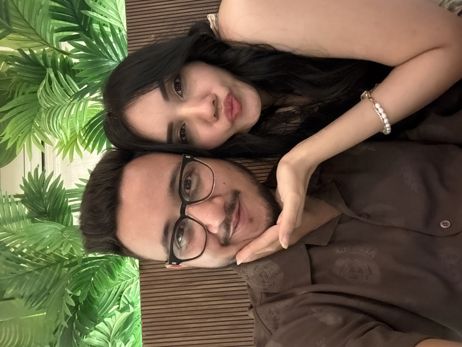 A close-up image depicts two individuals, one male and one female, positioned in what appears to be an indoor commercial setting such as a restaurant or cafe in Bidhannagar, India. The male, on the left, has a light complexion, dark hair styled upwards, a short beard, and wears dark-framed eyeglasses. He is clad in a brown collared short-sleeved shirt with subtle patterned designs. He smiles directly at the camera. The female, on the right, possesses a light complexion and long dark wavy hair. She wears a light-colored, possibly sleeveless or off-shoulder, top. Her left hand is observed cupping the male's chin, and she is making a pouting expression towards the camera. A bracelet featuring white pearls and a gold-toned chain is visible on her left wrist. The immediate background behind them consists of vertical wooden slats. Above this, a white wall is adorned with numerous artificial green tropical leaves. A white air conditioning unit is partially visible in the upper right section of the background. Both individuals are positioned closely, suggesting an intimate interaction.