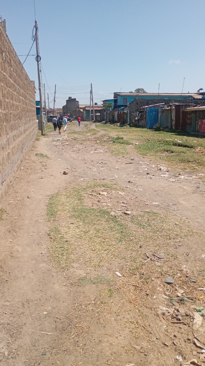 The image depicts a daytime scene in Mosop ward, Kenya, showing a narrow, unpaved dirt road or path