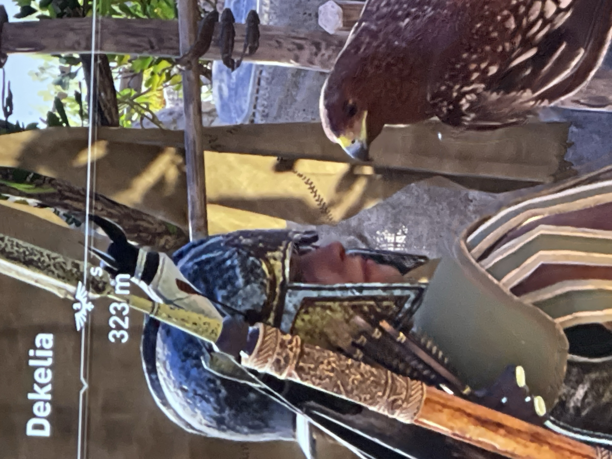 video game screenshot. The character is wearing a helmet and is possibly lying down. A bird of prey, likely an eagle or hawk, is perched nearby. The text "Dekelia" and "323/m" are visible on the left side of the screen, indicating a location or distance. Based on the helmet and the bird of prey, the game likely involves an ancient historical setting. Pomorie, Bulgaria is not a recognizable element of the image.