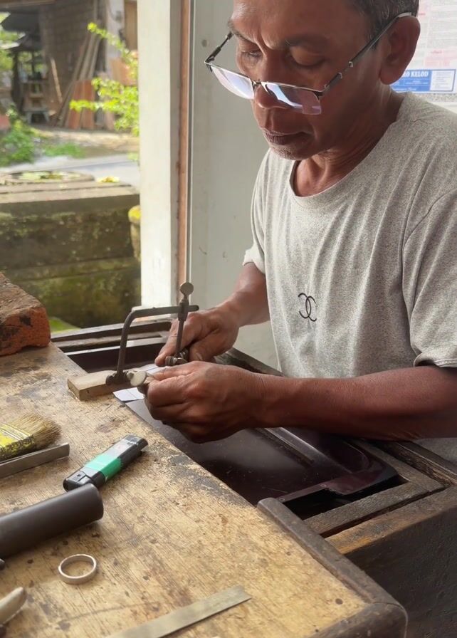 An older man with glasses is meticulously cutting a piece of wood with a small coping saw. He sits at a wooden workbench covered with tools like a lighter, a ring, a ruler, and a brush. The workbench is set up indoors, in front of a window with a view of an outdoor area with plants and a building. The man wears a grey t-shirt and is intently focused on his task, his hands guiding the saw with precision.