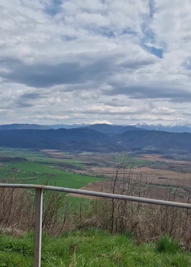 The camera slowly pans right, revealing a verdant valley overlooked by a range of mountains capped with snow. A sky with scattered white clouds provides the backdrop. In the foreground, a metal railing and sparse vegetation frame the view. To the right, a blue observation platform extends out, offering an unobstructed panorama.