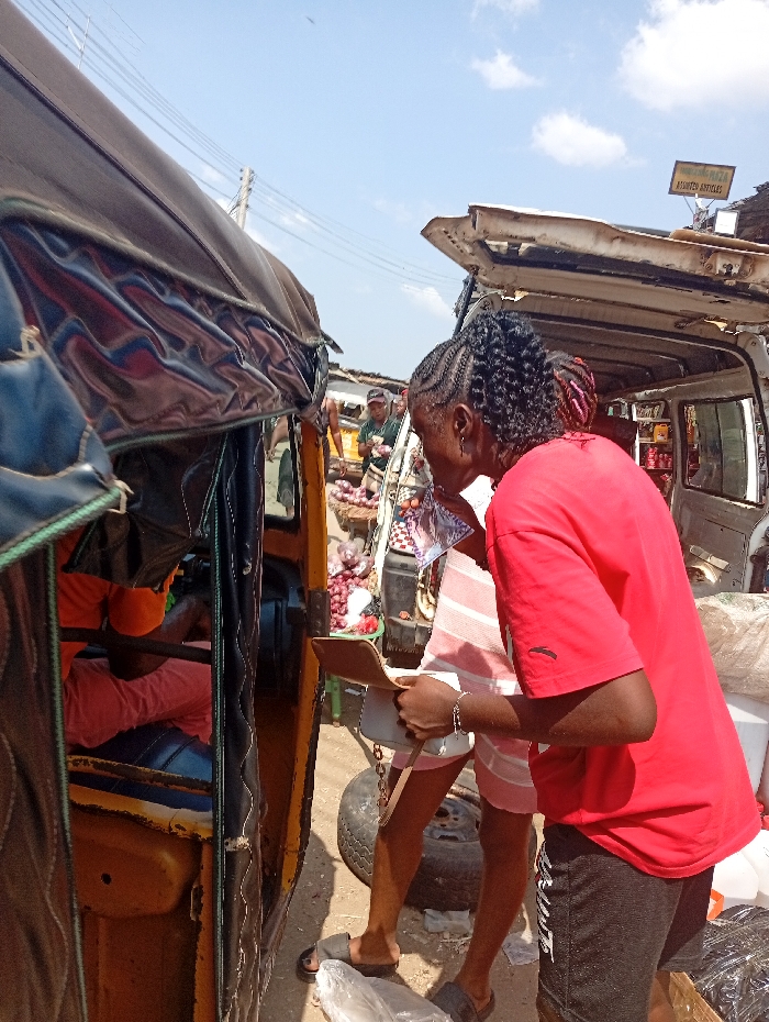 A woman in a red shirt and black shorts stands outside a yellow auto rickshaw. She holds a brown wallet and appears to be paying someone inside the vehicle. Next to the rickshaw is a white van with its back open, revealing goods inside. Behind the van and rickshaw, people and produce are visible. A sign is on top of the van. The scene appears to be a busy marketplace.