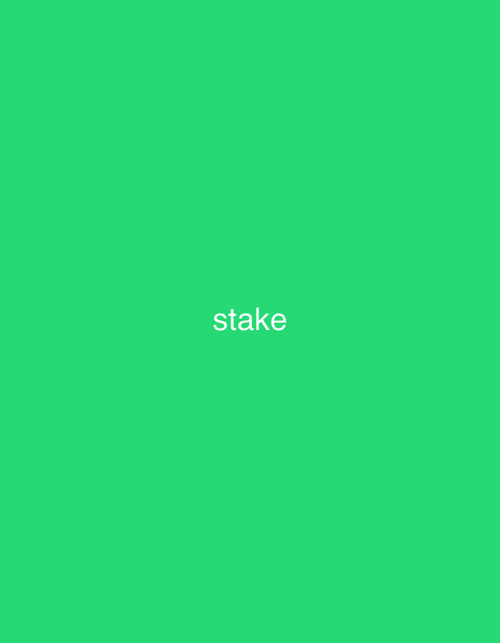 The image displays a solid emerald green background (hexadecimal color #28dd67). Centered on this background, in white sans-serif typeface, is the word "stake". No people, physical objects, discernible actions, interactions, or environmental features of Al-Qanawat Municipality, Syria, are depicted within this digital graphic. The scene is limited to the abstract graphical representation.
