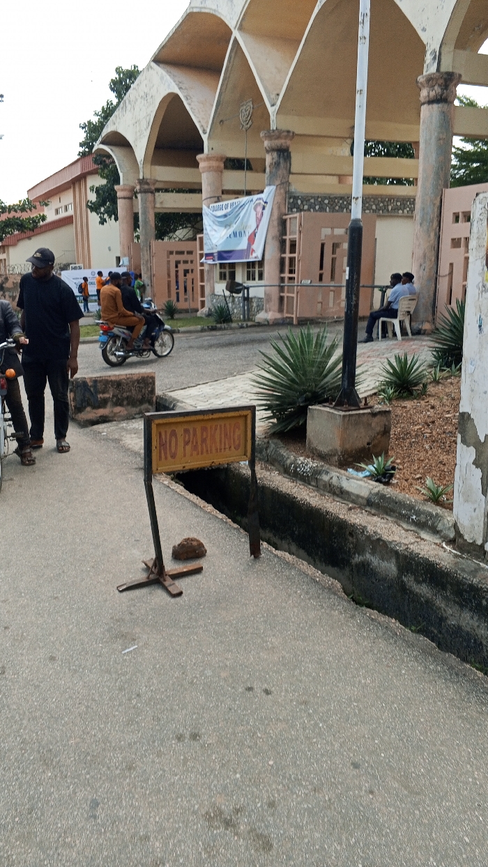 The image displays the entrance to a College of Health in Lokoja, Nigeria, during daylight hours. The foreground consists of an asphalt road surface with minor discolorations. A yellow rectangular "NO PARKING" sign with red lettering is mounted on a rusty, cross-shaped metal frame, leaning slightly left. A dark brown rock stabilizes its base. This sign is located at the edge of the asphalt, beside an open, concrete-lined drainage ditch. A black and white painted metal pole, secured in a concrete base, stands to the right of the drainage ditch. In the midground, a male individual in a black t-shirt, black trousers, and brown sandals walks or stands towards the right, partially visible on the left side. To his right, two males are positioned on a light blue/silver motorcycle, moving right; the driver wears a light brown shirt and trousers, while the passenger wears dark attire. The background is dominated by a large entrance structure with four light-colored concrete archways supported by decorative pillars. A circular crest is visible above the central arch. A white banner, featuring text including "COLLEGE OF HEALTH" and an image of a person with a stethoscope, is affixed between two pillars on the right side of the entrance. To the left of the entrance, a multi-story building with a light-colored facade and a reddish-brown roof is partially visible. To the right, two males sit on a light-colored plastic chair, facing left, dressed in light-colored collared shirts and dark trousers. Along the right side of the road, several agave-like plants are planted in landscaped beds. Distant figures are visible near another building in the far background.