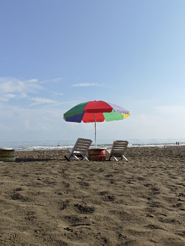 The image displays a beach scene in Reudeuep, Indonesia, under a clear blue sky with minimal scattered white clouds. The foreground consists of dark brown, coarse sand, showing some texture and minor irregularities. A multi-colored beach umbrella, featuring segments of red, green, blue, and yellow, is centrally positioned on the sand, its pole anchored upright. Two empty, white, slatted beach chairs are placed beneath the umbrella, facing the ocean. Between these chairs, a small cylindrical stand is present, constructed from two stacked, weathered objects painted red, resembling old tires. Further left, partially obscured, is another similar stacked object, painted yellow-green. The ocean occupies the mid-ground, showing small waves breaking near the shoreline. Light debris, possibly natural or refuse, is visible on the sand near the water's edge. In the distant shallow water on the right side of the frame, two small, dark, human figures are discernible standing, and a third faint, dark shape is visible further left in the water.