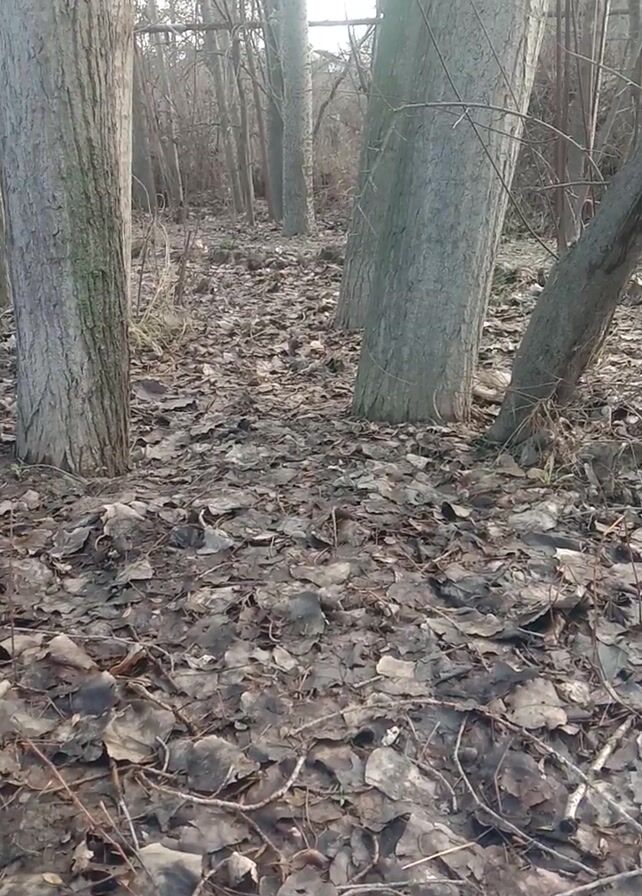 The camera is positioned low to the ground in a forest setting, oriented in portrait