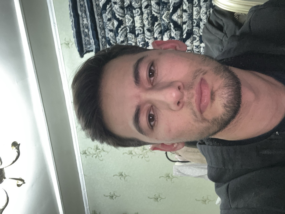 A man's face is centered, showcasing brown eyes, a prominent nose, and full lips. He has short, dark hair neatly styled and a trimmed beard. The background features wallpaper with a floral pattern and a curtain with a white and blue design. A chandelier is slightly visible on the left. The man wears a dark hoodie. The image is slightly out of focus.