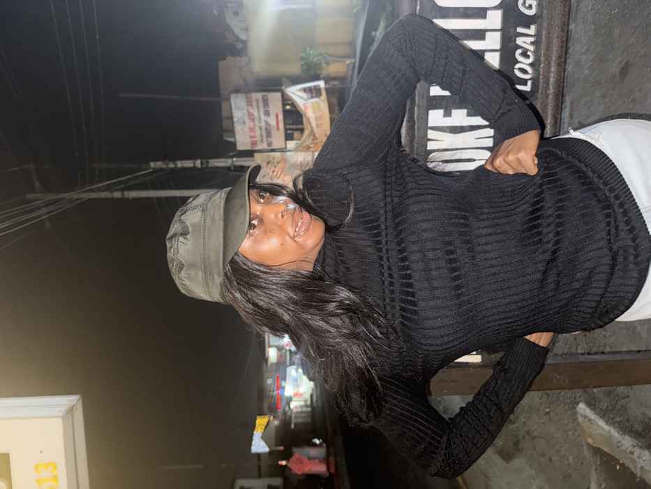 A person wearing a dark, ribbed long-sleeved shirt, white pants, and a green cap poses outdoors at night. The scene is lit by streetlights and other ambient sources, revealing buildings and street signs in the background. The person faces the camera at an angle, with one hand placed at their waist. Power lines are visible above, contributing to the urban setting.