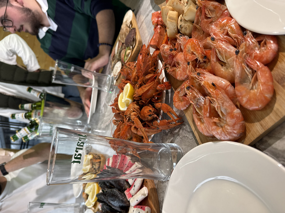 The scene depicts an indoor dining setting at a restaurant or similar establishment in Voskevaz, Armenia. The focal point is a table laden with various seafood dishes and beverages. In the mid-foreground, an empty, clear beer glass with green lettering is positioned centrally. To its immediate right, a large white plate holds a substantial quantity of cooked red crayfish, garnished with two lemon wedges. Adjacent to the crayfish, on a wooden board, are numerous cooked pink shrimp, some shelled and some unshelled, accompanied by several pieces of bread or mushrooms. To the left of the central beer glass, another wooden board displays dark-shelled mussels and rectangular pink-and-white seafood imitation sticks, alongside lemon slices. In the background, partially visible individuals are seated around the table. On the far right, a male individual with dark hair, a beard, and glasses wears a dark blue and green striped shirt with a white collar; he is looking and appears to be speaking towards the left. Further left in the background, another individual wears a dark olive green vest over a white long-sleeved shirt, with their hands resting on the table. A third person, wearing a white t-shirt and a watch, is partially visible on the far left. Two silver ice buckets containing multiple green-bottled beverages are positioned on the table behind the food, with one such bottle clearly displaying "JURAS" branding. An additional empty clear beer glass is visible on the right side of the table. A partial white ceramic plate is present in the bottom-left corner of the image. The table surface is a light-colored, patterned material, and the background features blurred wooden paneling and other indistinct elements of the indoor environment.