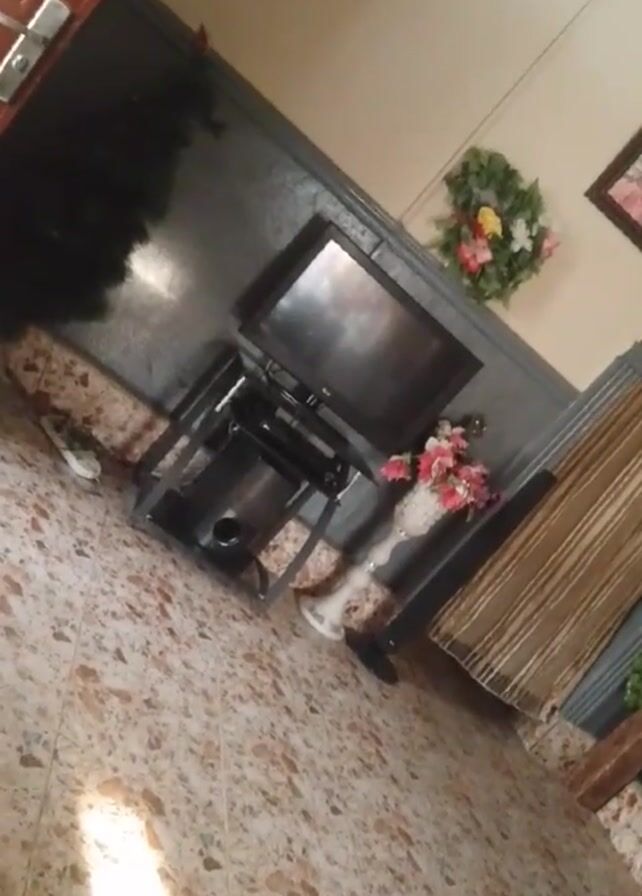 sparsely furnished room. There's a door with a silver handle on the left. The floor is tiled with a speckled pattern. In the center, there's a black flat-screen television on a black stand. Next to the TV stand, there's a white vase with pink and white artificial flowers. To the right of the flowers, there's a curtain. On the wall, there's a wreath of artificial flowers and a framed picture. The wall is painted a light beige color with a darker gray border. There is light coming through the window.