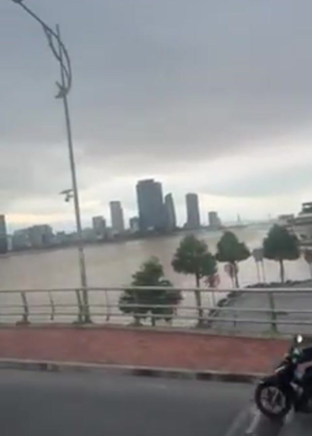 The video depicts a cityscape viewed from a bridge on a cloudy day