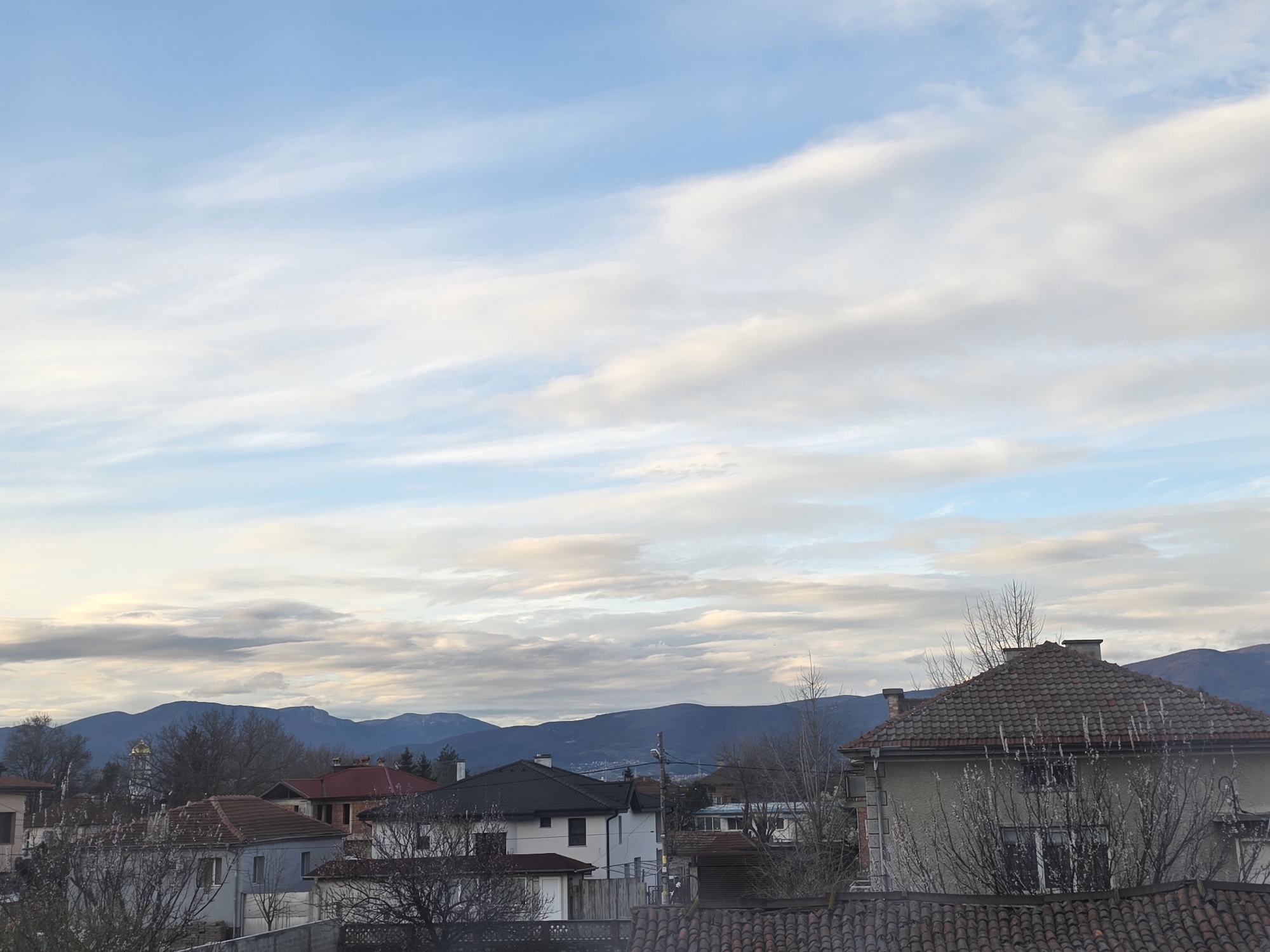 An eye-level, medium shot shows a view of Yagodovo, Bulgaria, with mountains in the background. The sky is a mix of blue and white clouds. In the foreground are a few buildings with red tile roofs. The trees in front of the buildings are bare.