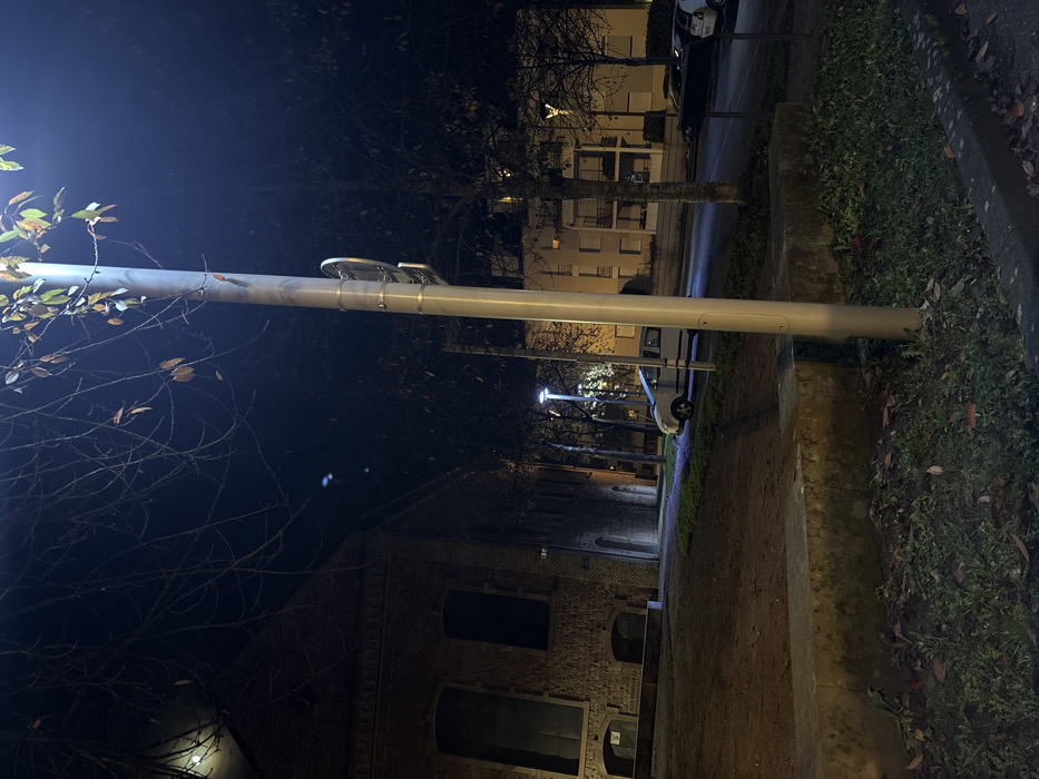 The image depicts a nighttime urban scene in Erstein, France, viewed from a slightly elevated perspective. In the immediate foreground, a dark gray curb borders a patch of sparse grass and fallen leaves. Behind this, a concrete retaining wall, stained with dirt or moss, runs horizontally across the frame. Centered in the mid-right, a tall, light-colored metal pole, likely a streetlamp, extends vertically out of the top of the frame, emitting a bright bluish-white light. A circular, reflective object is attached to the pole. Bare tree branches with a few scattered, light-colored leaves partially obscure the upper portion of the pole and the dark night sky. To the left of the pole, a dirt and grass slope descends towards a paved street. A white, compact four-door vehicle is parked on this street, facing left, illuminated by ambient light. Further down the street, another streetlamp is visible, casting a pool of light. On the far left, a large, multi-story building constructed of dark stone and reddish-brown brick dominates the background. It features multiple tall, dark, rectangular openings and at least one arched doorway on its lower level, all appearing unlit. Across the street from the white car and behind a line of bare trees, a lighter-colored, multi-story residential building with several windows and at least one balcony is discernible. A second, darker vehicle is parked further down the street near this building. No individuals are present in the scene. The overall illumination is artificial, originating from the visible streetlamps, contrasting sharply with the dark sky and deep shadows.