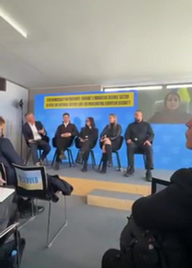 panel discussion with five people on a stage. The panel members consist of four people seated on chairs and one person on a video call displayed on a screen in the background. The panel members include three women and two men. The topic of the discussion is visible in a graphic displayed on the stage backdrop and relates to defense technology partnerships, Ukraine, and European security. An audience is viewing the panel discussion from off-camera. At one point, a photographer walks into view to take pictures of the panel.
