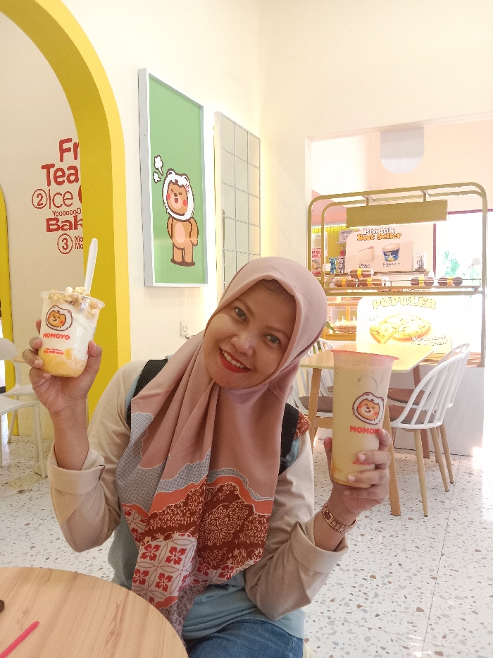 A woman is seated indoors at a Momoyo establishment in Madiun, Indonesia