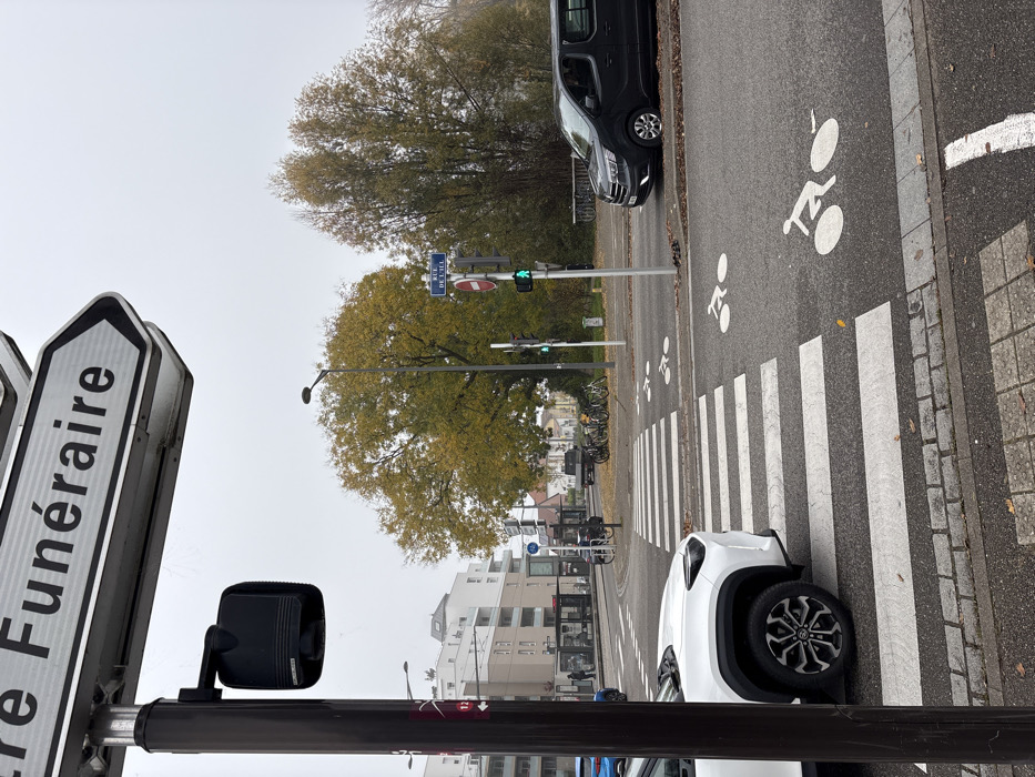 This image depicts an urban intersection at Rue de l'Île in Bischheim, France, under an overcast sky. In the immediate foreground on the left, the front portion of a white compact SUV with black fender trim and multi-spoke wheels is visible, positioned at a pedestrian crosswalk. A dark pole extends vertically, bearing a black rectangular device, and above it, a white arrow-shaped street sign points right with the partially visible text "Funéraire." The asphalt road features clearly marked white pedestrian crosswalk stripes and multiple white bicycle lane symbols. To the right of the pedestrian crossing, a black passenger van is positioned near the curb, facing toward the left side of the frame. A blue street sign, mounted on a pole, displays "RUE DE L'ILE." Adjacent to this, traffic lights show a green signal for pedestrians (a green walking figure) and a green circular light, indicating permission to proceed. In the mid-ground, a large tree with distinct yellow-orange autumn foliage dominates the right side of the frame. Beyond the traffic lights and tree, a cluster of bicycles is parked near a fence or railing. Further in the background on the left, multi-story modern residential buildings with balconies line the street. A bus or tram stop shelter is visible, with at least one individual standing underneath it. Another blue vehicle is partially visible behind the white SUV. Towards the center-right background, another darker utility vehicle or pickup truck is visible in the distance, partially obscured by trees. The overall environment suggests an active urban street with infrastructure supporting various modes of transportation.