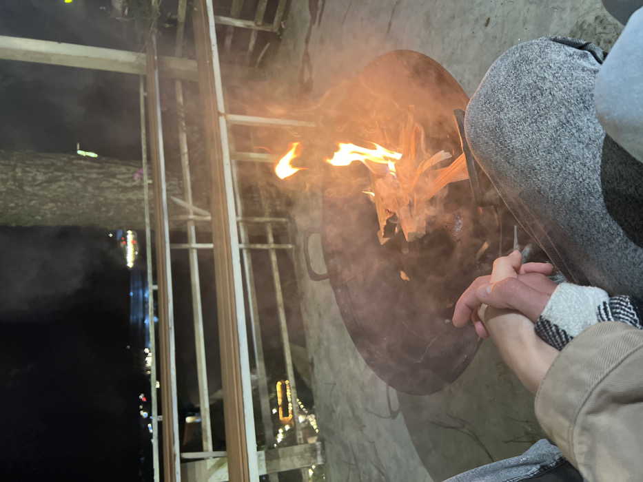 The image depicts an elevated outdoor patio or viewing deck at night in Thành phố Đà Lạt, Vietnam, featuring a prominent bonfire and two individuals