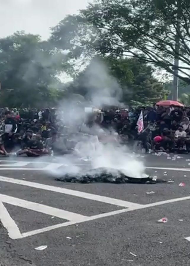 group of people gathered in a street with smoke rising from a fire in the center of the road. The people are standing and sitting around the edges of the road, watching the fire. There are trees in the background and the sky is overcast. The fire is small, but it is producing a lot of white smoke. The crowd is dense, with people of various ages and ethnicities. There is a road marker on the asphalt around the burning fire. The mood seems tense, but the exact purpose of the gathering is unclear.