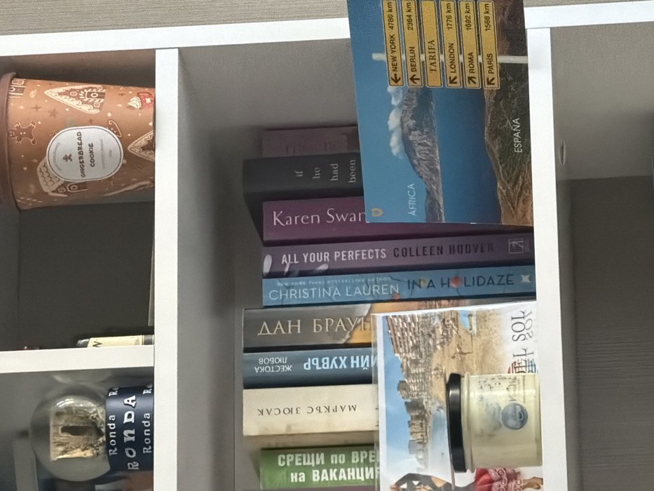 The image displays a two-tiered white bookshelf populated with various items. On the top shelf, from left to right, a clear glass snow globe with a dark blue base reading "Ronda" contains a golden miniature building. Next to it, a portion of a dark bottle with a light label is visible. To the right, a brown cylindrical container decorated with gingerbread cookie motifs features a white circular label stating "GINGERBREAD COOKIE". The bottom shelf contains a row of books standing upright, alongside two flat prints or postcards and a jar. From left to right, the books include titles in Bulgarian such as "СРЕЩИ по ВРЕМЕ на ВАКАНЦИЯ" and "ЖЕСТОКА ЛЮБОВ," as well as English titles like "IN A HOLIDAZE" by Christina Lauren, "ALL YOUR PERFECTIONS" by Colleen Hoover, and a book by Karen Swan. A book by Dan Brown is also present. In front of the books, on the left, sits a light-colored jar with a dark lid, possibly a candle or cream container. To its right, a horizontal print depicts a sandy beach with buildings and people, with "EL SOL" partially visible at the bottom. On the far right of the shelf, another horizontal print titled "AFRICA" and "ESPAÑA" shows a coastline with a mountainous island and features a signpost graphic indicating distances to cities like New York (4786 km), Berlin (2364 km), London (1776 km), Roma (1692 km), and Paris (1568 km), along with Tarifa. The background wall appears to be a light, neutral color. No specific visual information within the image identifies the precise location within the city of Sofia, Bulgaria.
