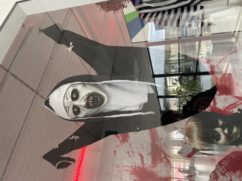 The image displays a horror-themed visual presented behind a glass partition within a building in Schiltigheim, France