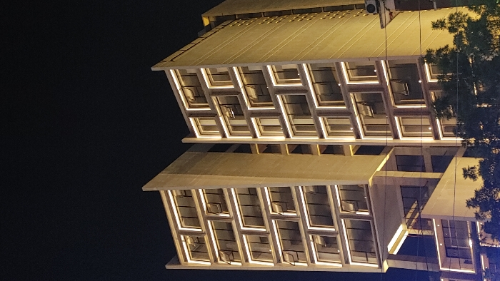 The image depicts a multi-story modern building at nighttime, situated in the city of Unknown, Unknown. The structure features a distinct, illuminated facade composed of two primary sections that appear conjoined or closely positioned. The building's exterior is bathed in a warm, yellowish light, highlighting its vertical concrete or stone panels. A grid-like arrangement of windows defines the upper floors, with prominent white linear LED lighting outlining many of the window frames and architectural recesses, creating a bright, geometric pattern against the dark sky. Numerous windows are visible, some fully closed, while others are partially open, tilting inwards from the top. Trees with visible foliage are present at the bottom of the frame, partially obscuring the lower levels of the building. No individuals or specific actions are discernible within the scene.